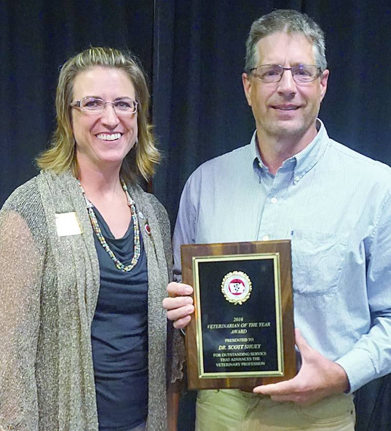 CORNING – Dr. Scott Shuey was recognized as Iowa Veterinary Medical Association (IVMA) Veterinarian of the Year by IVMA President Dr. Jennifer Schleining at the Sept. 9 annual meeting in Ames.