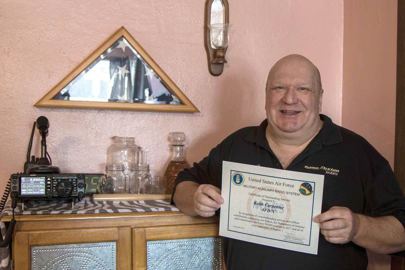 Keith Carpenter of Bridgewater opened his mail one day last week to find a certificate he had never seen or heard of before. It’s a United States Air Force Military Auxiliary Radio System Certificate of Outstanding Service. It was given to him, “in recognition of your outstanding service and selfless contributions supporting our Nation, the Department of Defense and United States Air Force MARS mission in 2017 and all of your teammates in Region 7.” Carpenter said it is the first time he has ever seen this certificate from the US Air Force MARS.