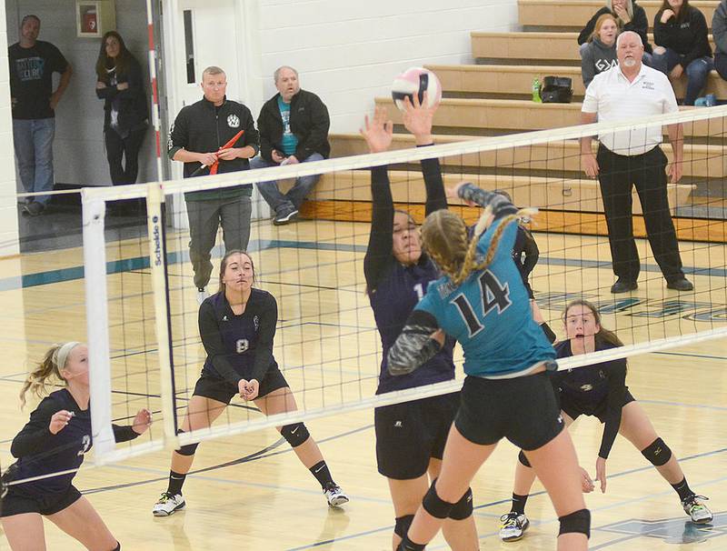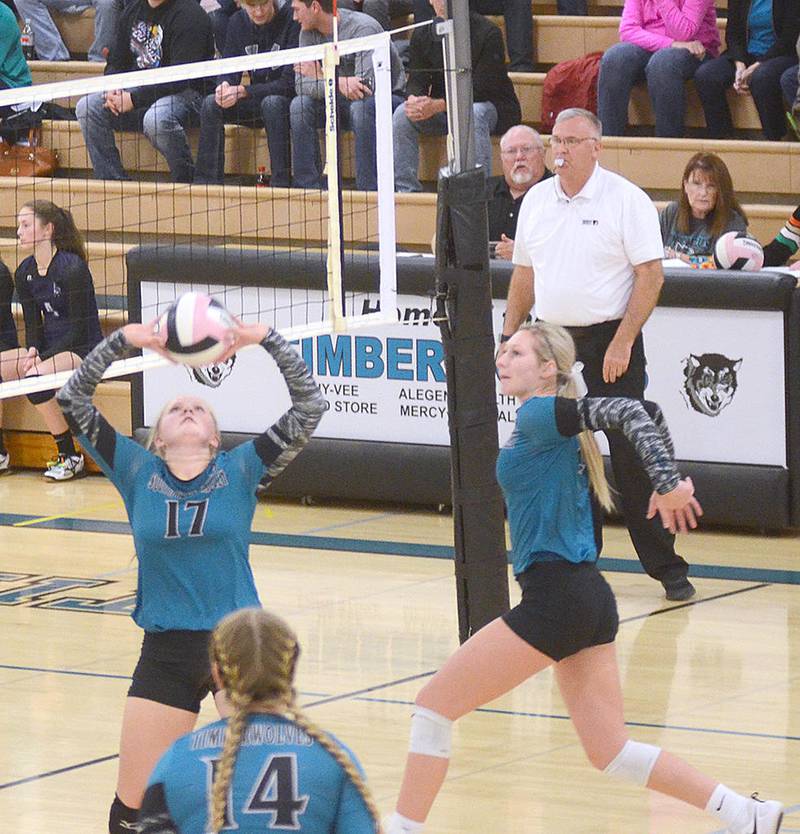 The team sang “Happy Birthday” to Jentry Schafer afterward as the team’s hitting leader observed her 18th birthday Tuesday. It took awhile for the Timberwolves’ attack to get going, but Schafer did show a nice mix of tips and hard-hit attacks to finish with a team-high 13 kills, pushing her season total to 287. Kayley Myers added nine kills to go with 13 of 15 serving and three digs.