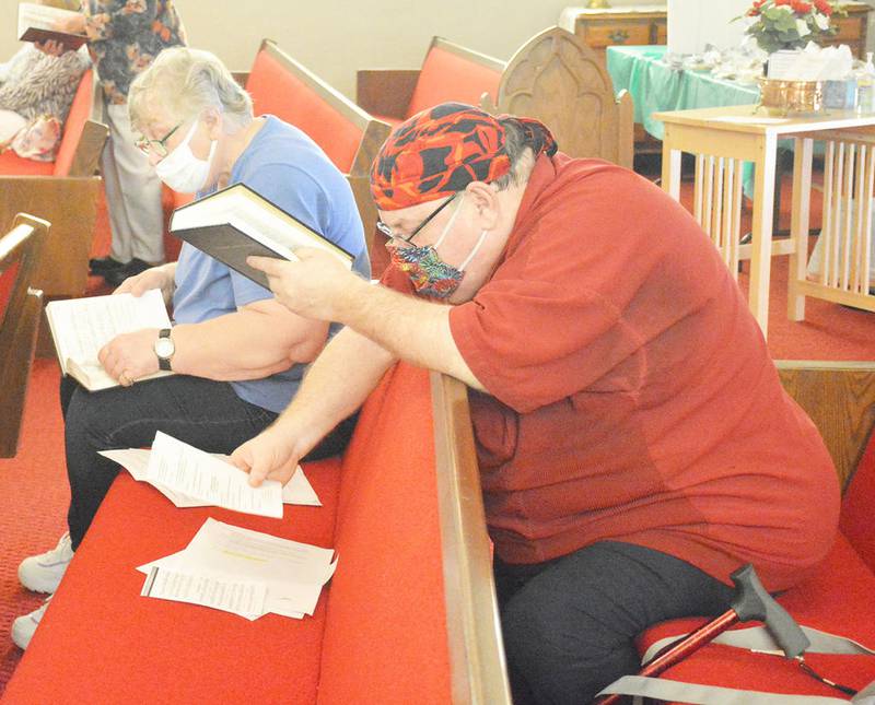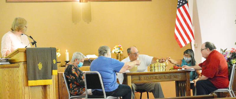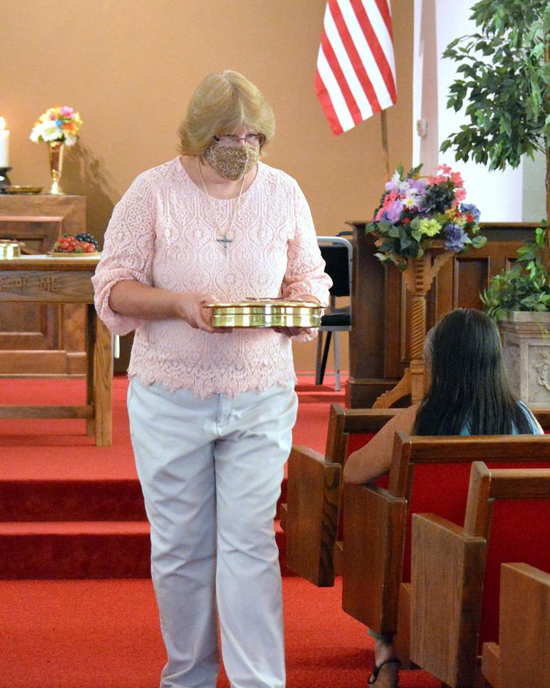 Due to coronavirus concerns, the congregation of 15 sat scattered out in the sanctuary, masks were worn through most of the service and hymns were “sung” in silence to the sound of the organ.