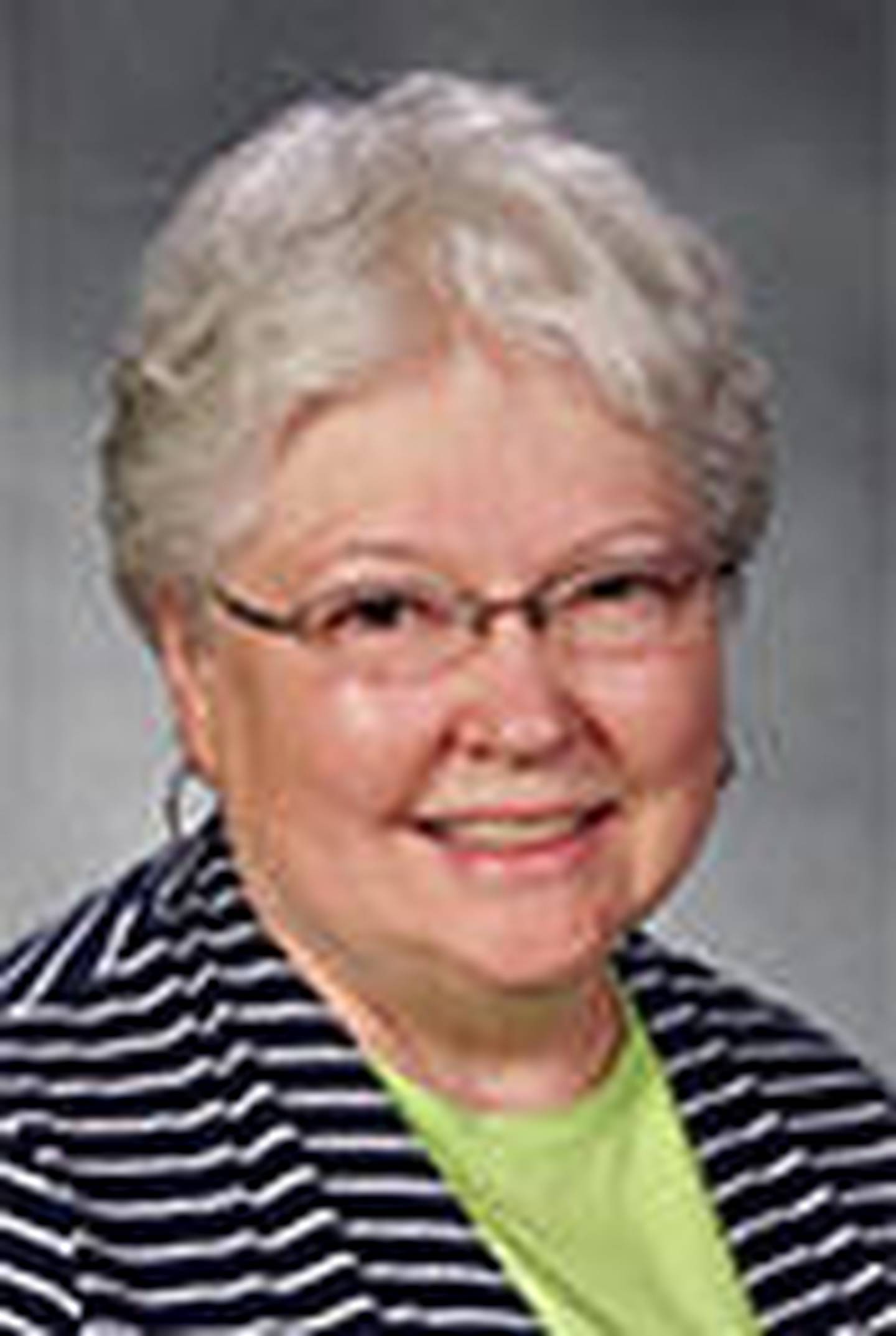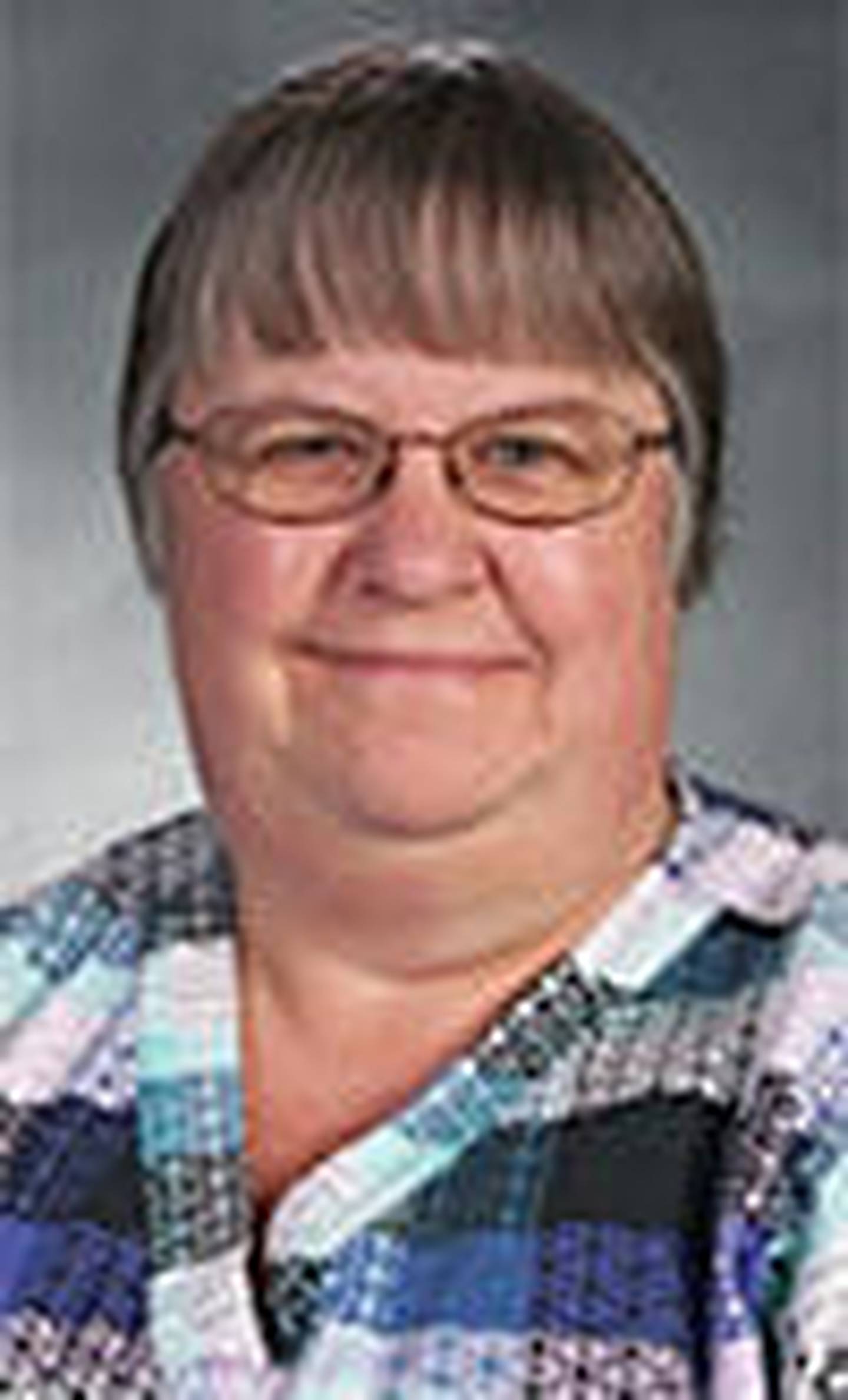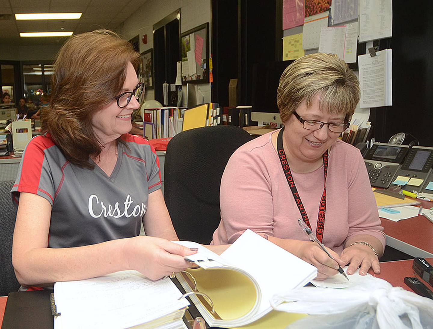 Danette Lesan, Creston Community Middle School secretary, left, works with her successor, Darla Lorenz, in going over duties of the job. Lesan is retiring after working 21 years in Creston schools. (CNA photo)