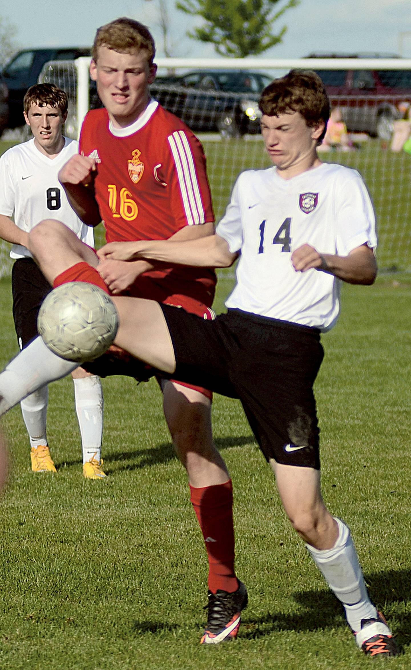 Creston junior Tyler Peters (14) settles the ball in a collision with Nicholas Wanniger (16) during Tuesday's match here. Behind the play is Panther junior Dawson Smith (8). Creston took a 1-0 lead over the seventh- ranked Knights before Kuemper rallied in the second half for a 4-1 victory. (CNA photo)
