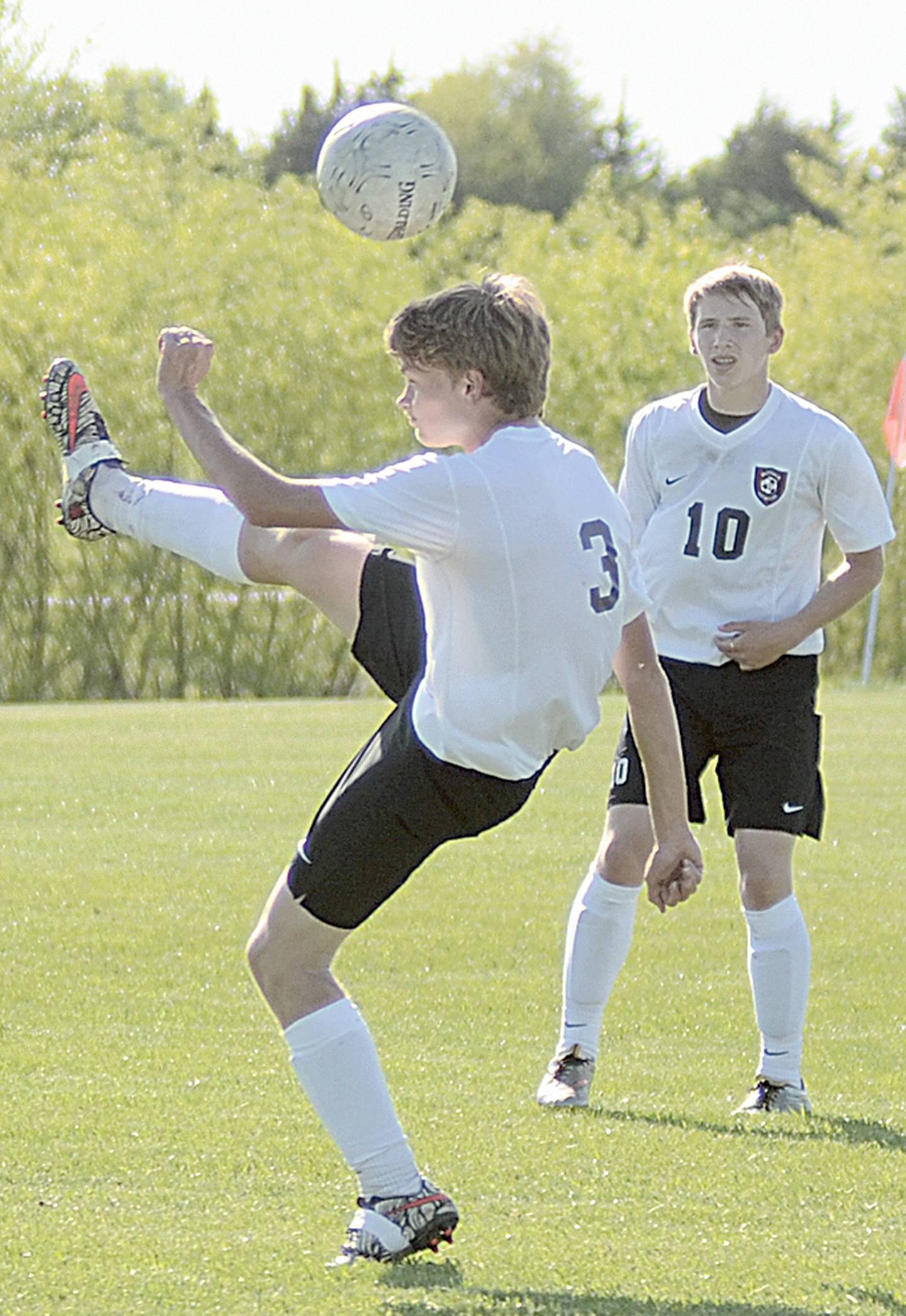 Creston defender Cole Higgins executes a bicycle kick to send the bal behind him toward the Panther offensive field as teammate Evan Jacobson (10) looks on. (CNA photo)