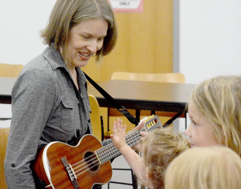 Megan Barrett of Madison County Music Company in Winterset, armed with her ukulele, brought smiles to the young and young at heart during a Wednesday morning sing along held as part of the Greenfield Public Library’s regular story time program recently.