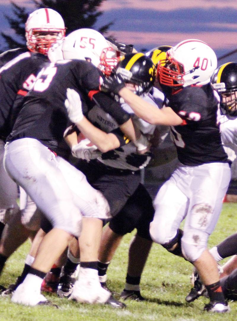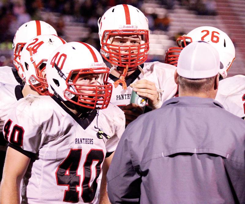 Creston/O-M senior linebacker Alex Tamerius (40) listens to head coach Brian Morrison during a timeout in Creston/O-M's loss to Clarinda earlier this season. After going through two major knee surgeries, Tamerius has worked his way back to the Panther starting lineup for his senior season. (Contributed photo)