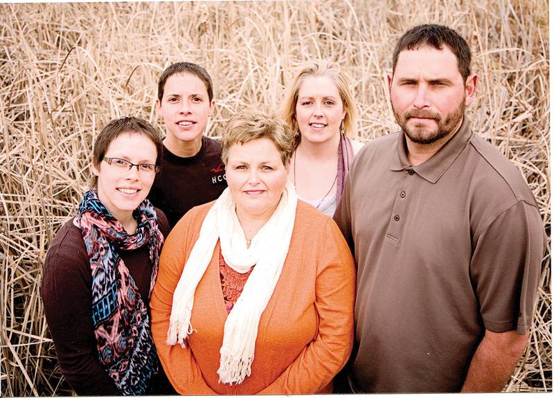 Emily Edwards, left, poses with her twin sister Erin, mother Kathy, sister Heather and brother Waylon for a family portrait.