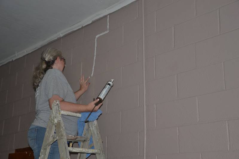 Sandy Seals of Creston uses caulk to fix cracks in the wall.